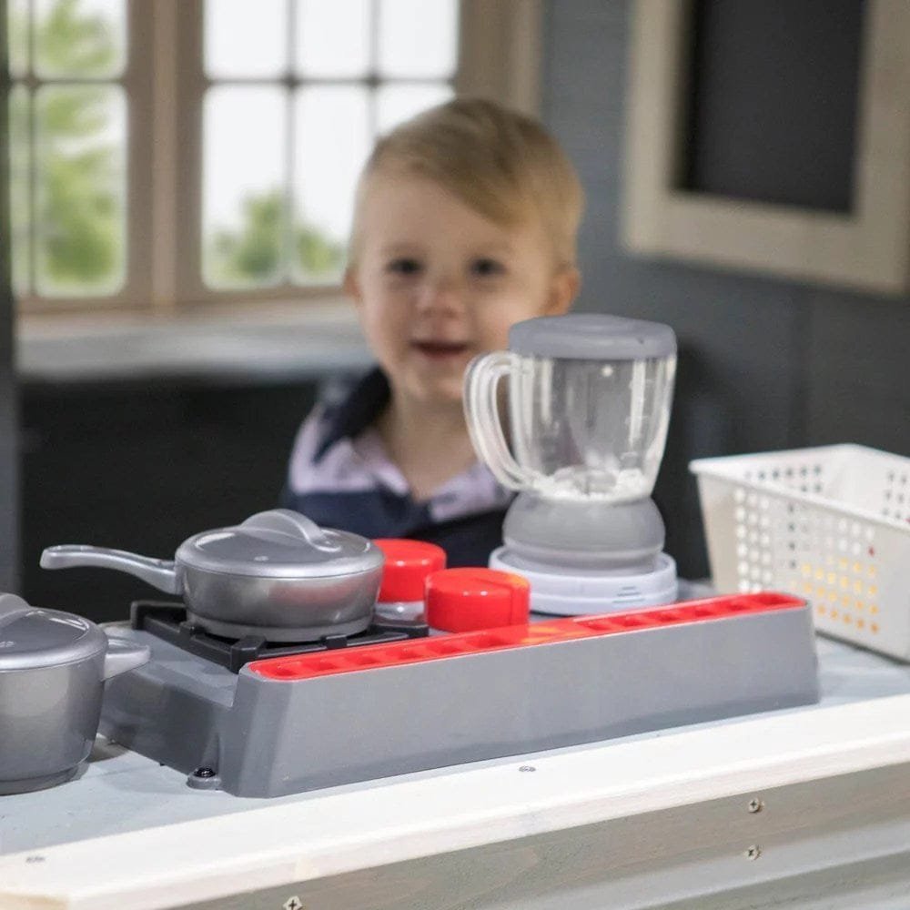 The spacious Spring Cottage playhouse by Backyard Discovery will set your backyard apart from all others. This enormous playhouse is the largest and most unique in its category. The beautiful colors and contemporary curved roof design will surely turn a head or 2. Your children will enjoy the outdoors by skipping through the garden gate on their way around the back to sit at the snack window and prepare feasts in the fully-stocked kitchen for all your neighbors. Whether your kids are sending notes back and forth in the mail box, creating their own masterpiece on the chalkboard. This cedar playhouse will provide your kids-hours of endless fun and imagination while playing with 1 of the 13 interactive features also including the sliceable fruit, flower box, porch light, doorbell, toy phone and stove top with battery powered appliances