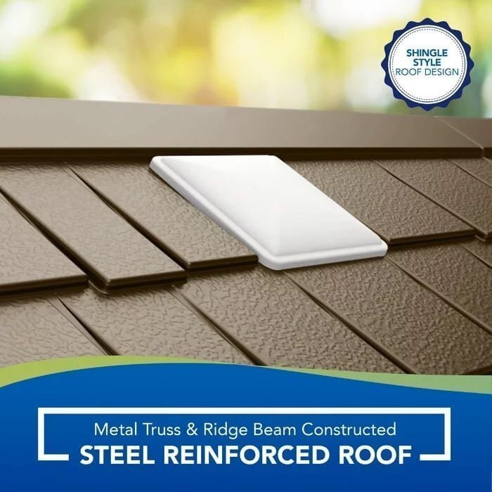 Make outdoor organization simple with this product. The capacity provides ample space to store large outdoor items such as garbage cans and recycling bins, long-handled garden tools, ladders, bikes, and more. It’s durable, multi-wall resin construction is the weather, water, and UV-resistant and can withstand adverse weather conditions and wind gusts up to 60 mph. The double doors provide a wide opening to access items in the shed, and a padlock can be used to lock the unit for extra security (lock not included). The built-in vents allow for proper airflow, and multiple windows provide natural light and visibility into the shed. The reinforced floor provides extra support for heavier items such as tractors and ride-on lawnmowers with recommended install on a level, concrete foundation. It also offers convenient maintenance – simply wipe with a damp cloth for easy cleanup. This storage shed is easy to assemble with minimal tools required. The decorative siding panels and shingle-pattern roof make this shed an attractive and functional outdoor storage solution.