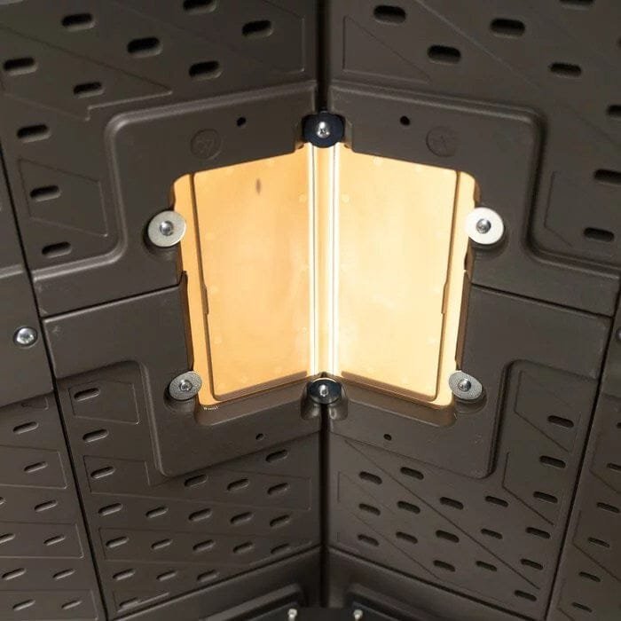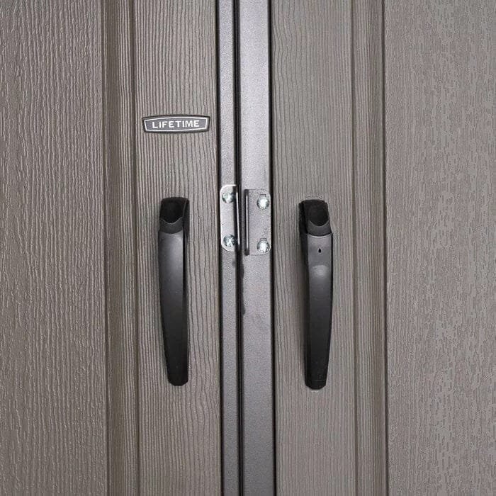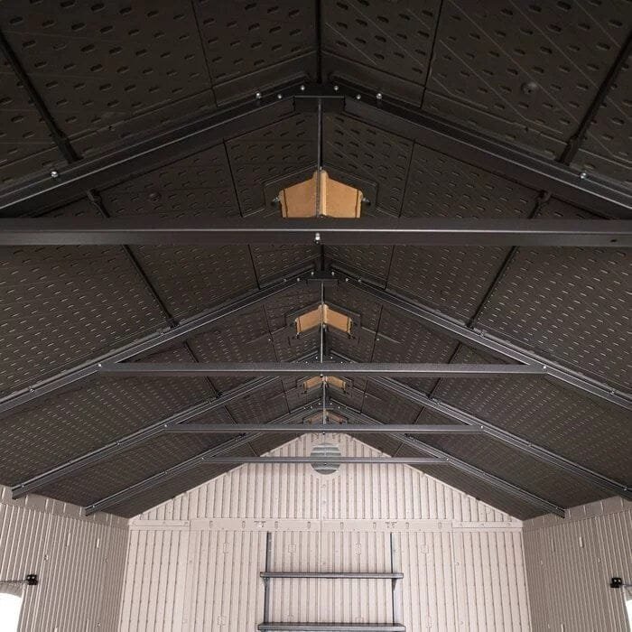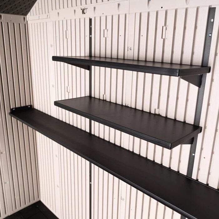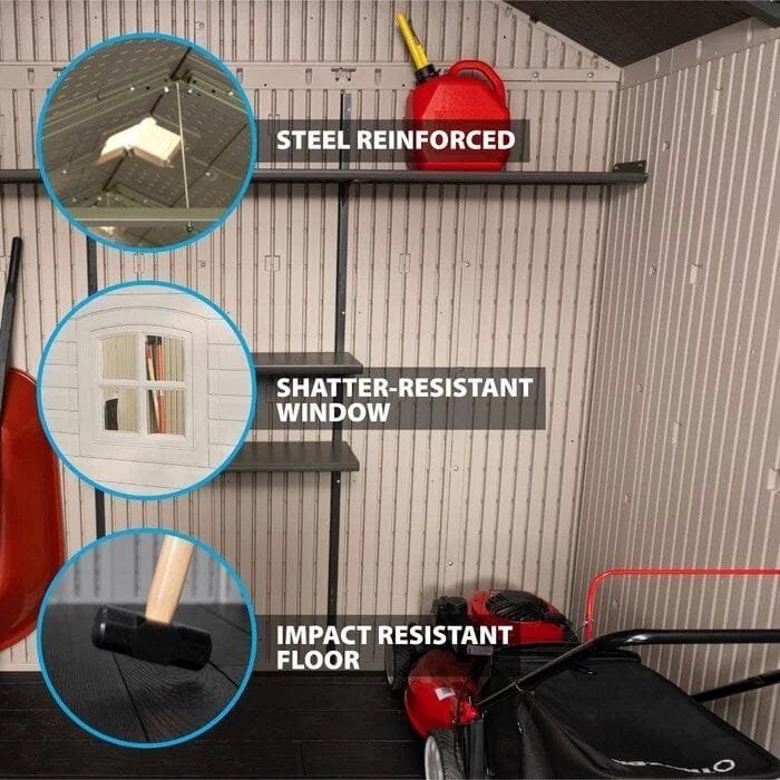 Shed TypeStorage ShedPrimary MaterialPlastic; MetalMaterial DetailsHigh-density polyethylene and steelPowder Coated FinishYesColorDesert Tan and Dark BrownStorage Capacity621 cubic feetFoundation RequiredYesFoundation IncludedNoRecommended Foundation Size94″w x 148″dFloor IncludedYesImpact Resistant FlooringYesFloor MaterialPlastic/PolyethyleneWindows IncludedYesNumber of Windows2Functional WindowsYesWindow Lock IncludedYesBuilt-In Shelving IncludedYesNumber of Shelves5Ventilation IncludedYesShingles IncludedNoSkylight IncludedYesFlower Box IncludedNoNumber of Doors2Door StyleDouble DoorPadlock Compatible DoorsYesYear-Round UseYesWind Rating65Weather ResistantYesFire ResistantYesWater-ResistantYesUV ResistantYesRot ResistantYesRust ResistantYesMildew ResistantYesImportedYesAssembly