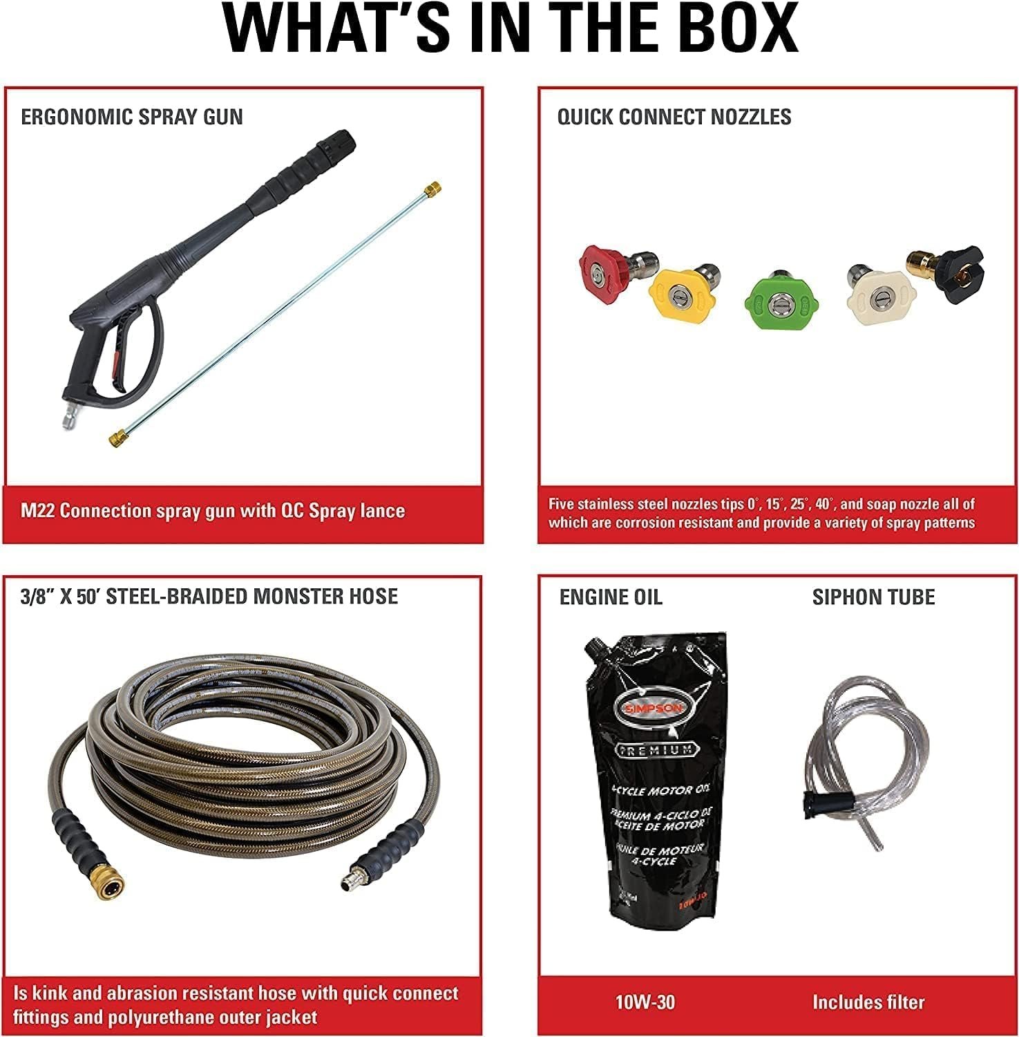 - LONG HOSE REACH: The Simpson Monster series 50′ dual-braided high-pressure hose resists kinks and abrasion; Non-marring polyurethane jacket helps protect finished surfaces; Quick-connect fittings speed setup