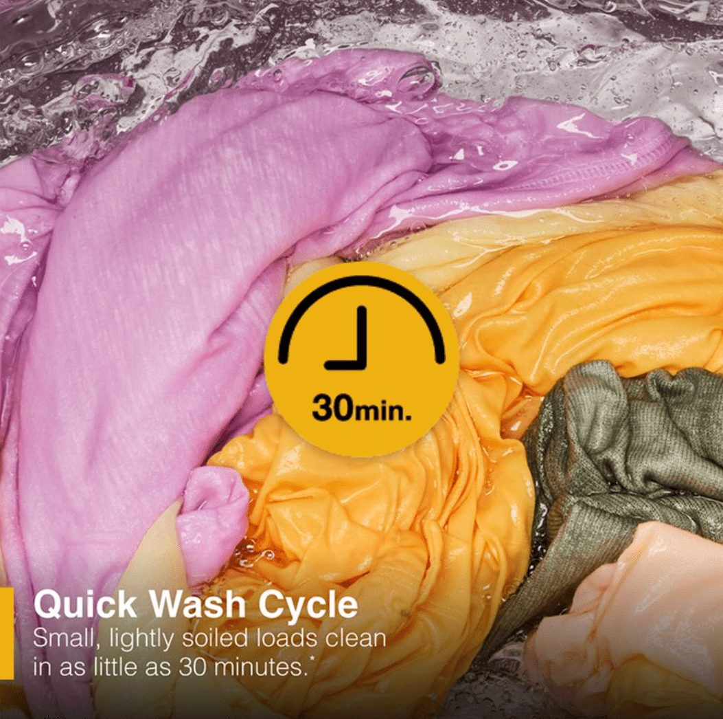 - Quick Wash Cycle – Clean small, lightly soiled loads in as little as 30 minutes (based on a 3-lb load).